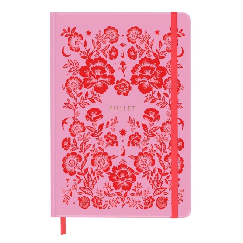 - Diseño elegante: Tapas duras en color rosa con estampado de flores y la palabra grabada "Bullet". Puntas redondeadas que combinan funcionalidad y estética.