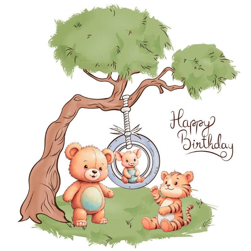 Transfer con preciosas ilustraciones de divertidos animales infantiles celebrando su cumpleaños.