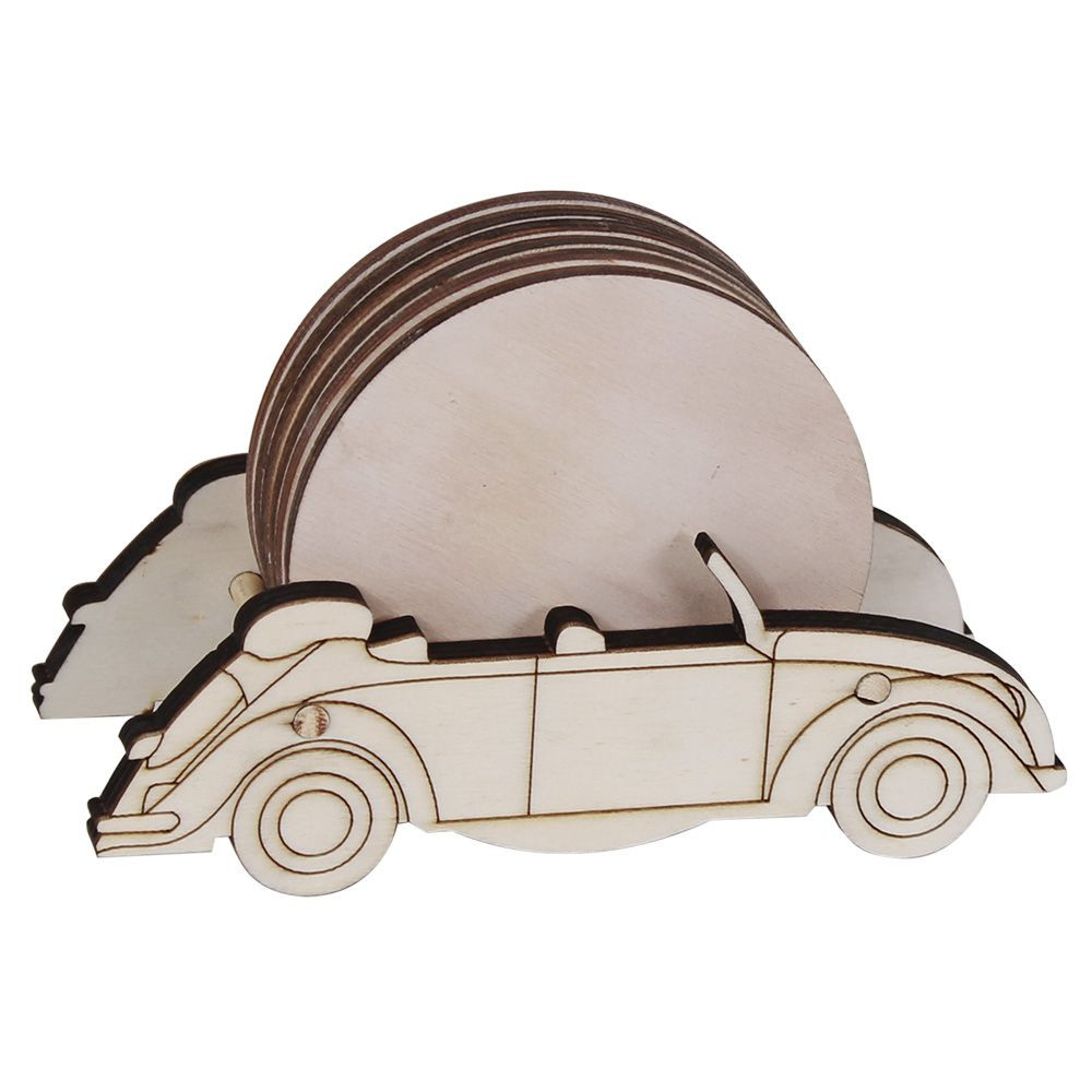 Se trata de un kit de madera para pintar y decorar a tu gusto, que incluye un soporte de madera con forma de coche Volkswagen escarabajo descapotable y 6 posavasos redondos.