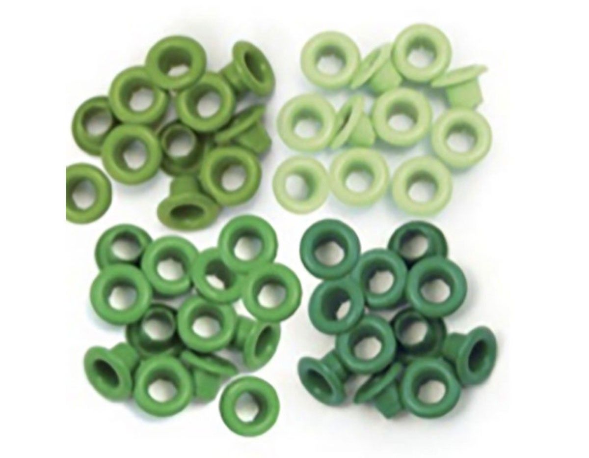 Pack de 60 ojales de aluminio en 4 tonos de verde diferentes. Eyelets Crop A Dile de We R Memory Keepers.
