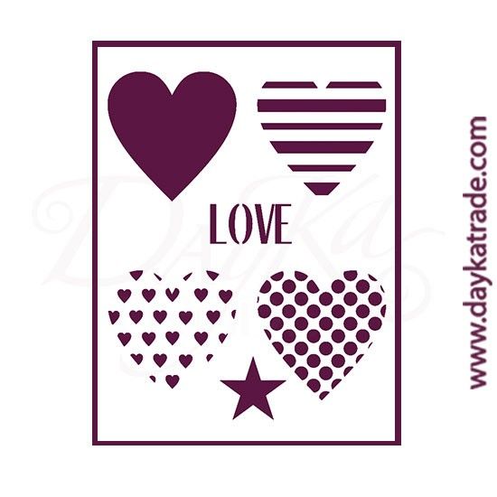 Plantilla de estarcido con diseño de corazones, palabra "love" y estrellita.