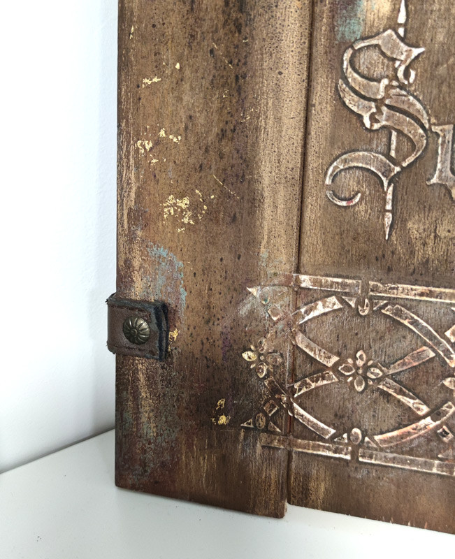 Tablilla de madera de pino desigual Portada Libro de los Secretos decorado y pintado a mano por Nuria.