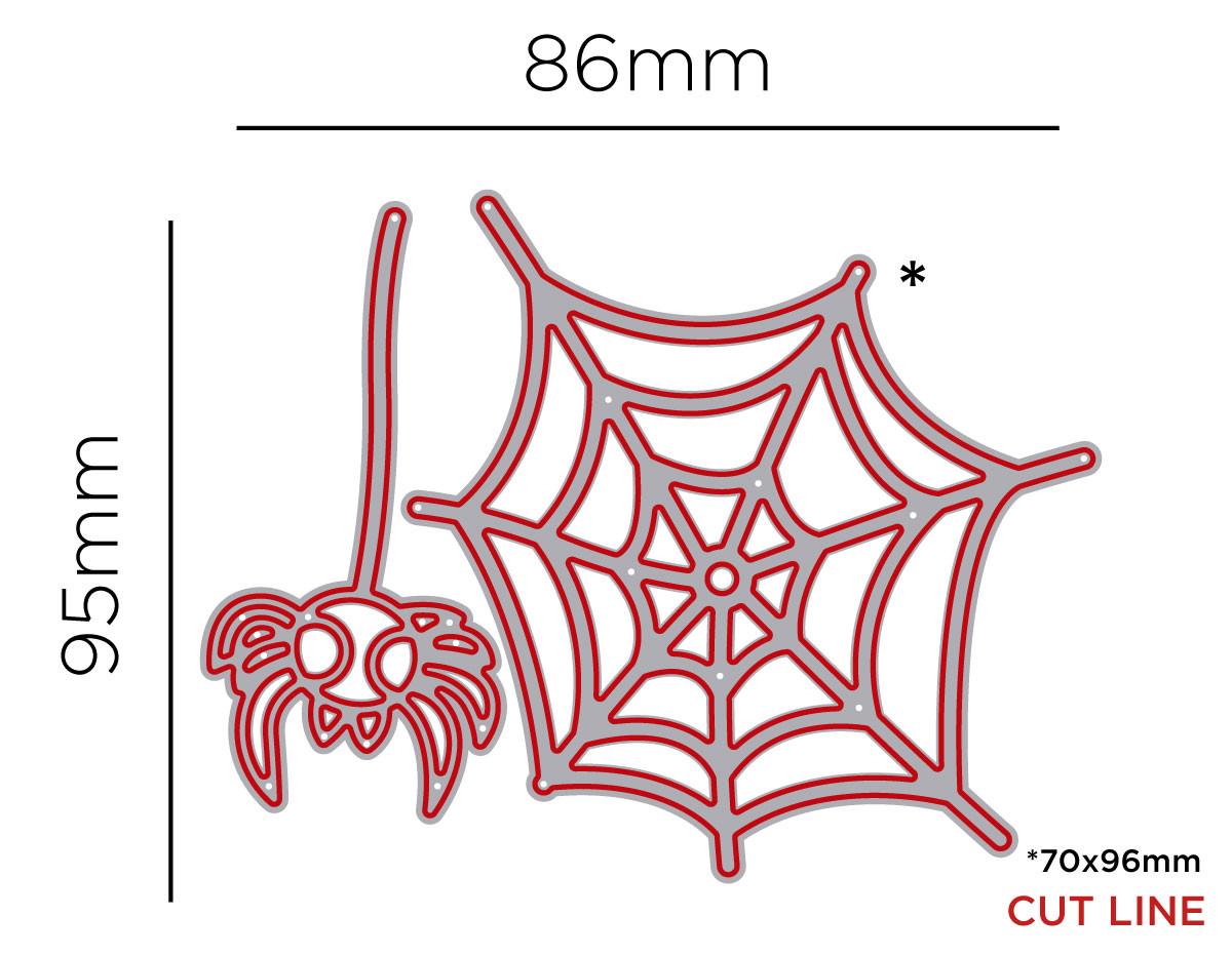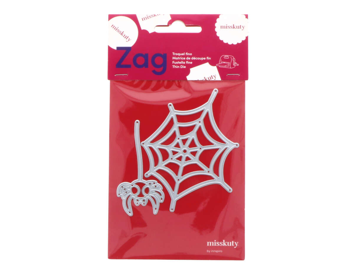 El set incluye 2 troqueles individuales Zag Misskuty para crear telarañas y arañas colgantes.
