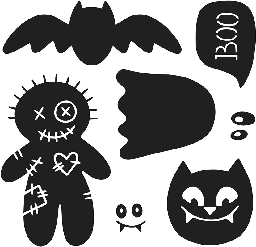 Set de troqueles de Halloween con murciélago, muñeco terrorífico, fantasma y gato.